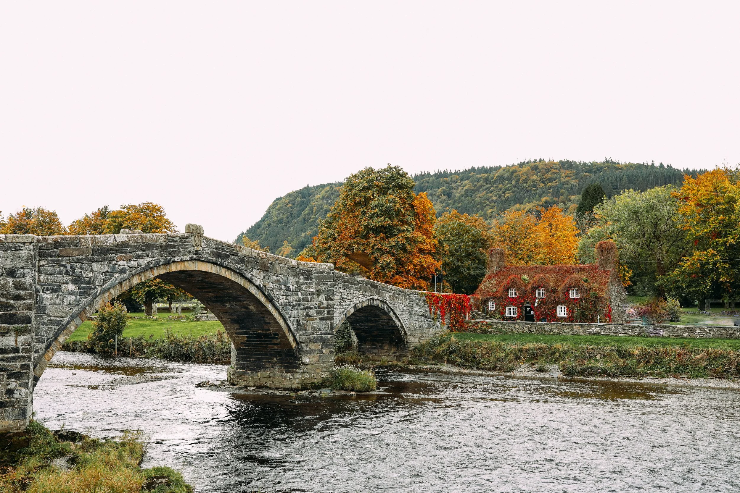 When I first learned about this bridge a few years ago, it became of high priority to visit the next time we were in Snowdonia. That dream came true when finally, on a mild autumnal afternoon, my family and I wandered through the village of Penmachno to see if we could find the bridge. Thanks to a local, he pointed us towards a small opening in the wood that would lead us down to the river for a stunning view. Through bramble and mud, we eventually found our way to the riverbank. That view vista looking back towards the bridge silenced us in quiet reverence. Surely we had stepped out of our real life and into a storybook. The kids skipped stones across the pristine waters unmoved by the bridge. Most definitely a moment to remember.