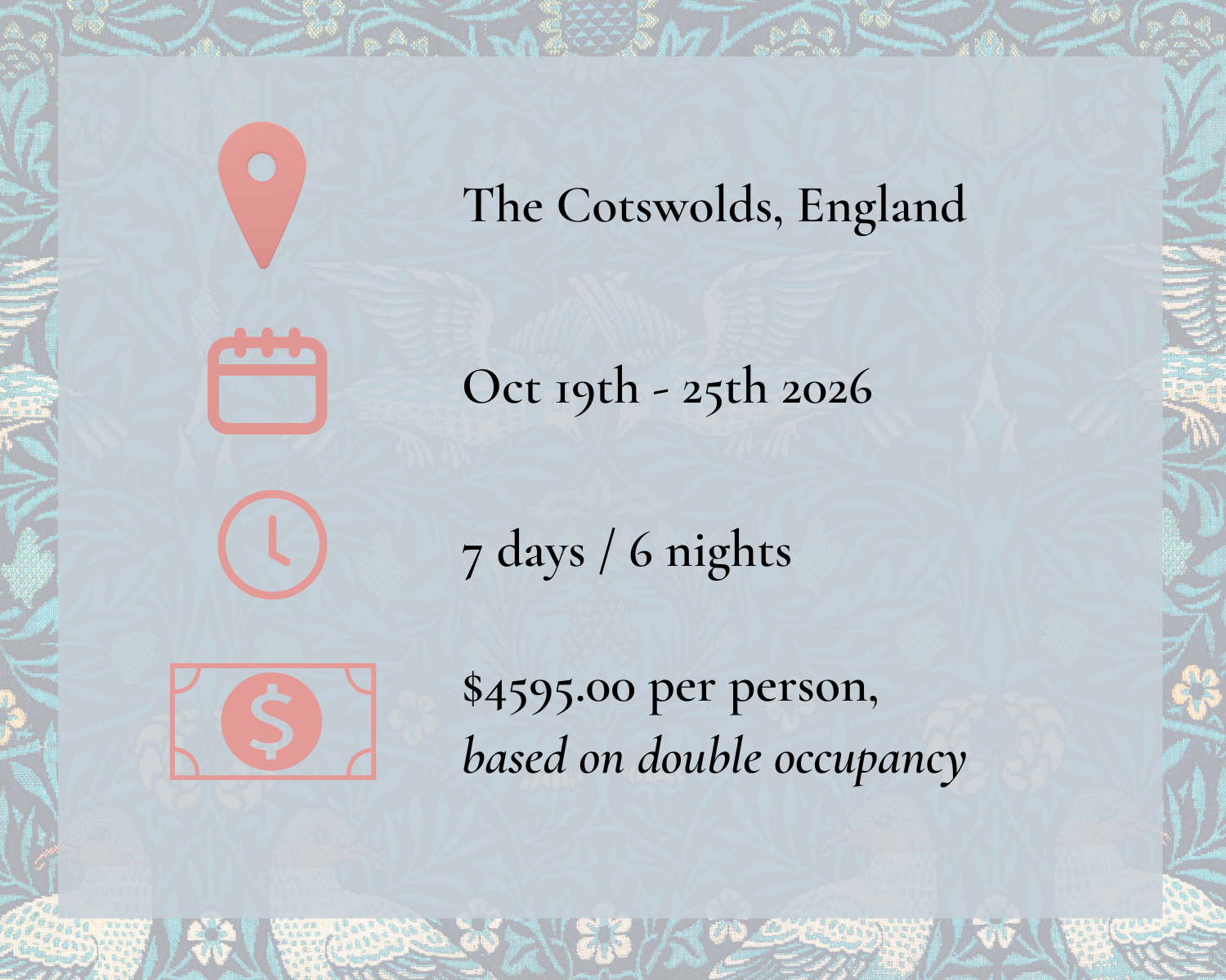 DAY SIX OCT 24TH (Southern Cotswolds) Free Day. Sleep in, linger over breakfast. Enjoy a countryside amble. Book a massage or beauty treatment at the onsite treatment room. A few ideas: A day trip to Blenheim Palace, visit Kelmscott Manor, home to William Morris, or visit other villages in The Cotswolds. Farewell feast together.