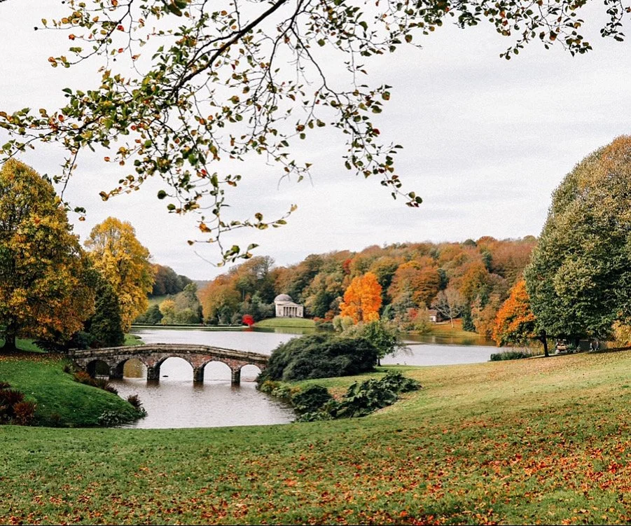 Marvel at the autumnal beauty of Stourhead Gardens, a world-renowned landscape of lakes and temples
