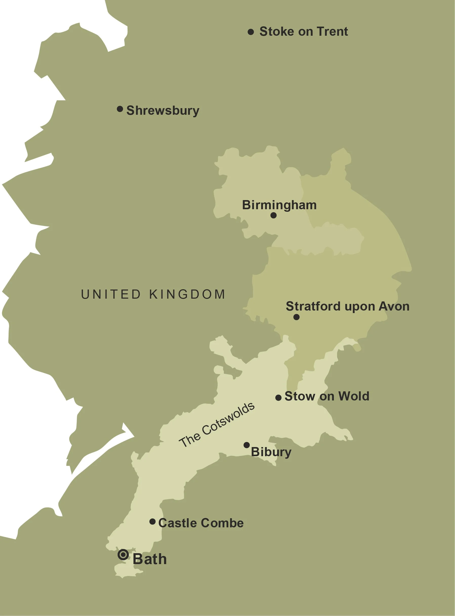 Moderate walking: 4-6 miles throughout the day, moderate hills and stairs. Bus 2 hr 45 mins. Sleep in Cotswolds.