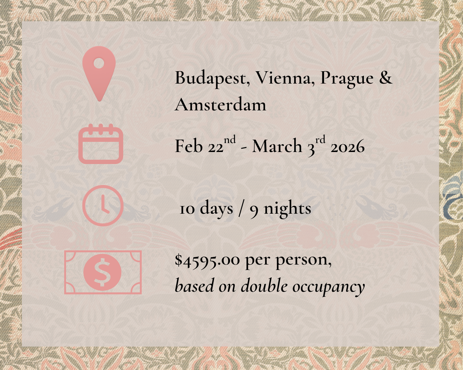 DAY FOUR FEB 25th | BUDAPEST TO VIENNA A slow morning rail ride carry us from Budapest to Vienna. Upon arrival, we settle into our design-forward hotel, take a short walk through the neighborhood, and gather for a traditional meal. Optional evening chamber music in a salon completes the day.