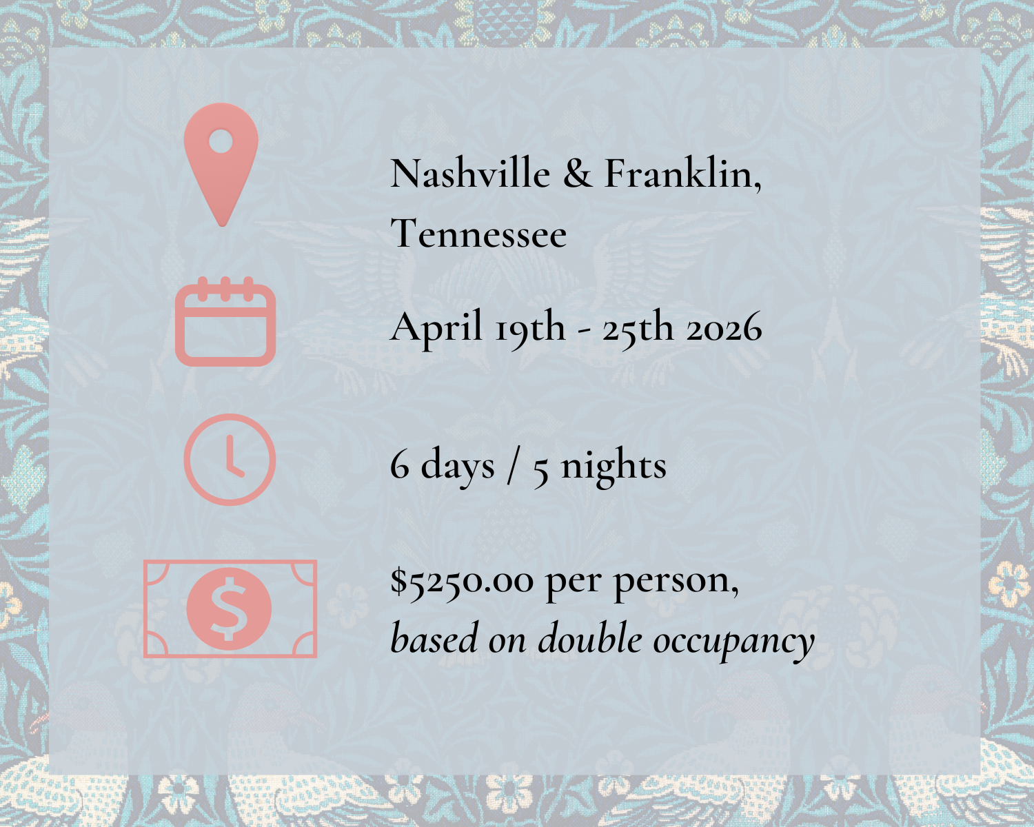 Begin your journey in Music City. Settle into your hotel and together we will go for a leisurely guided overview of Nashville’s storied streets. In the evening, we’ll gather for a toast to the days ahead, either in the hotel’s cozy bar or beneath the moody lights of Skull’s Rainbow Room. Our private welcome dinner sets the tone: thoughtful, intimate, and undeniably Southern. End the first night on Broadway listening to music at Robert’s Western World.