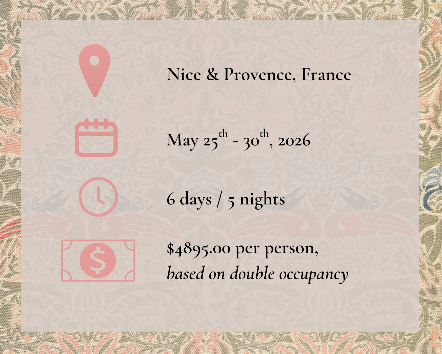 Double occupancy. Beautiful, centrally located accommodations; $895 for single supplement (single rooms - only 4 available
