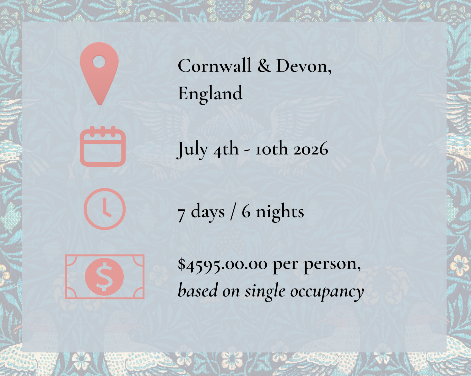 DAY THREE JULY 6TH | ST AGNES HEAD, PORT ISSAC, TINTAGEL & BODMIN MOOR. Today we travel south to Cornwall and trace England’s wild western edge, beginning at St Agnes Head, where dramatic cliffs and abandoned tin mines overlook the vast Atlantic (Poldark country). From there, we wander the narrow lanes of Port Isaac, a privately owned fishing village of whitewashed cottages and quiet harbors, seemingly untouched by time. Turning inland, the landscape opens into the haunting expanse of Bodmin Moor, stopping at the storied Jamaica Inn, long associated with smugglers and legend. As we continue through Cornwall and into Devon, rolling moorland and hedgerows unfold, a day shaped by sea air, stone, and the enduring myths of the English countryside.