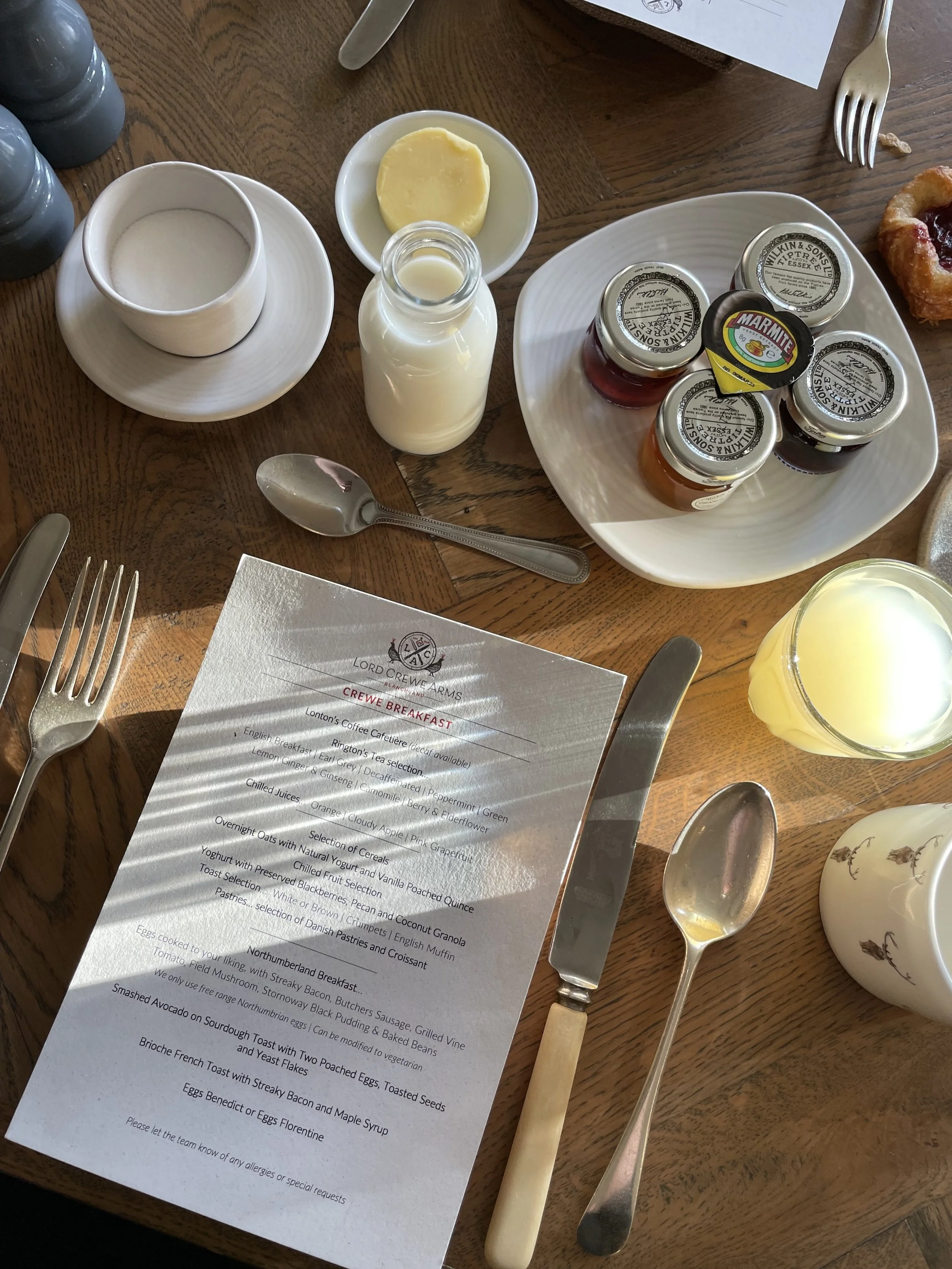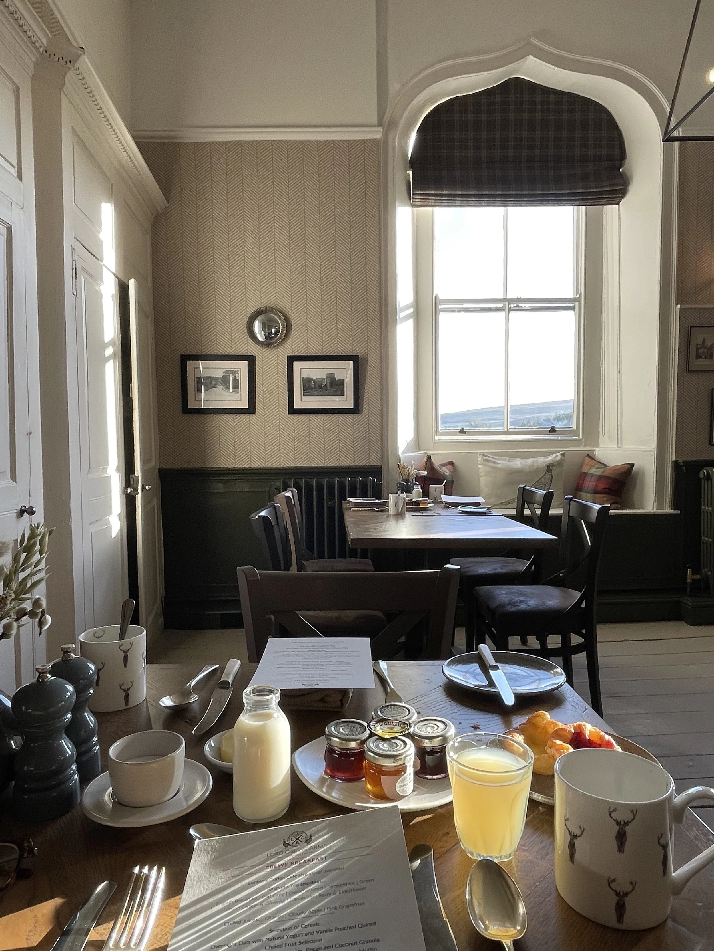 Each morning, I walked a short distance to the lovely dining area where the sunshine poured into the space with views towards the moorland. Breakfast’s short choice includes fresh fruit salad and Bircher muesli plus cooked-to-order dishes including eggs how you want and a choose-your-own grill. There are fresh pastries and juices set out when you arrive.
